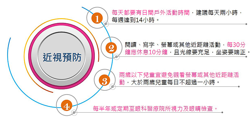 根據臺大醫院研究報告,台灣地區近視發生之年齡有兩個尖峰時段,一個是在7至8歲,另一是在13至14歲。平均小學一年級至國三每年約增加100度,高中、大學以後逐漸趨緩。小朋友越早近視,近視惡化的速度就越快。所以近視預防越早越好,須注意以下事項: