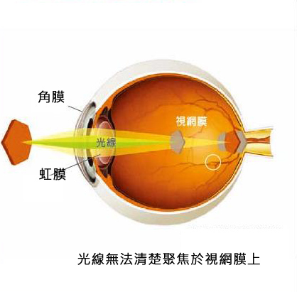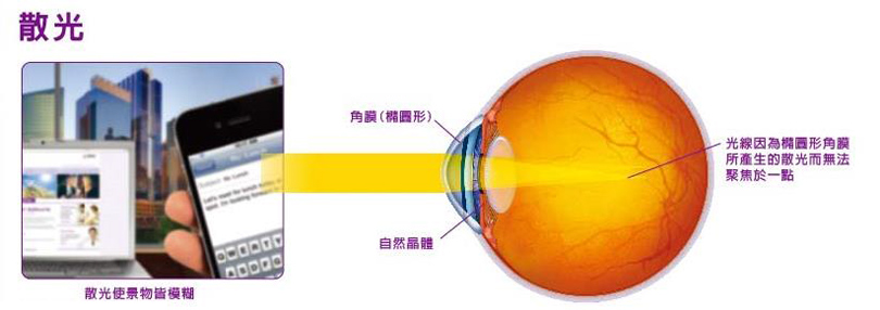 在健康的人體眼睛內,角膜為圓弧曲狀,如同籃球般。散光發生在當角膜的圓弧曲狀如同雞蛋時。當光線經過有散光的角膜時,影像無法清楚的聚焦在視網膜上,導致模糊影像。